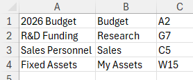 Notice that the table doesn't really need any column headings. I will, however, select the cells and give them a name. In this case, I'll use the name JumpTable. Using three columns in the table allows flexibility in specifying destination worksheets and cells. In fact, over time you can make any changes in the table desired, and your hyperlink will still work just fine.