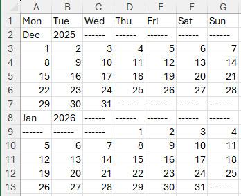 Again, cell A1 contains a date such as 1/1/26, which is the first day of the desired month's calendar. You can finish out the calendar by adding a header row (Sun, Mon, Tue, etc.) and changing the formatting of the cells containing dates that are not within the desired month. You can also format the rest of the cells in the grid to show the dates as desired.